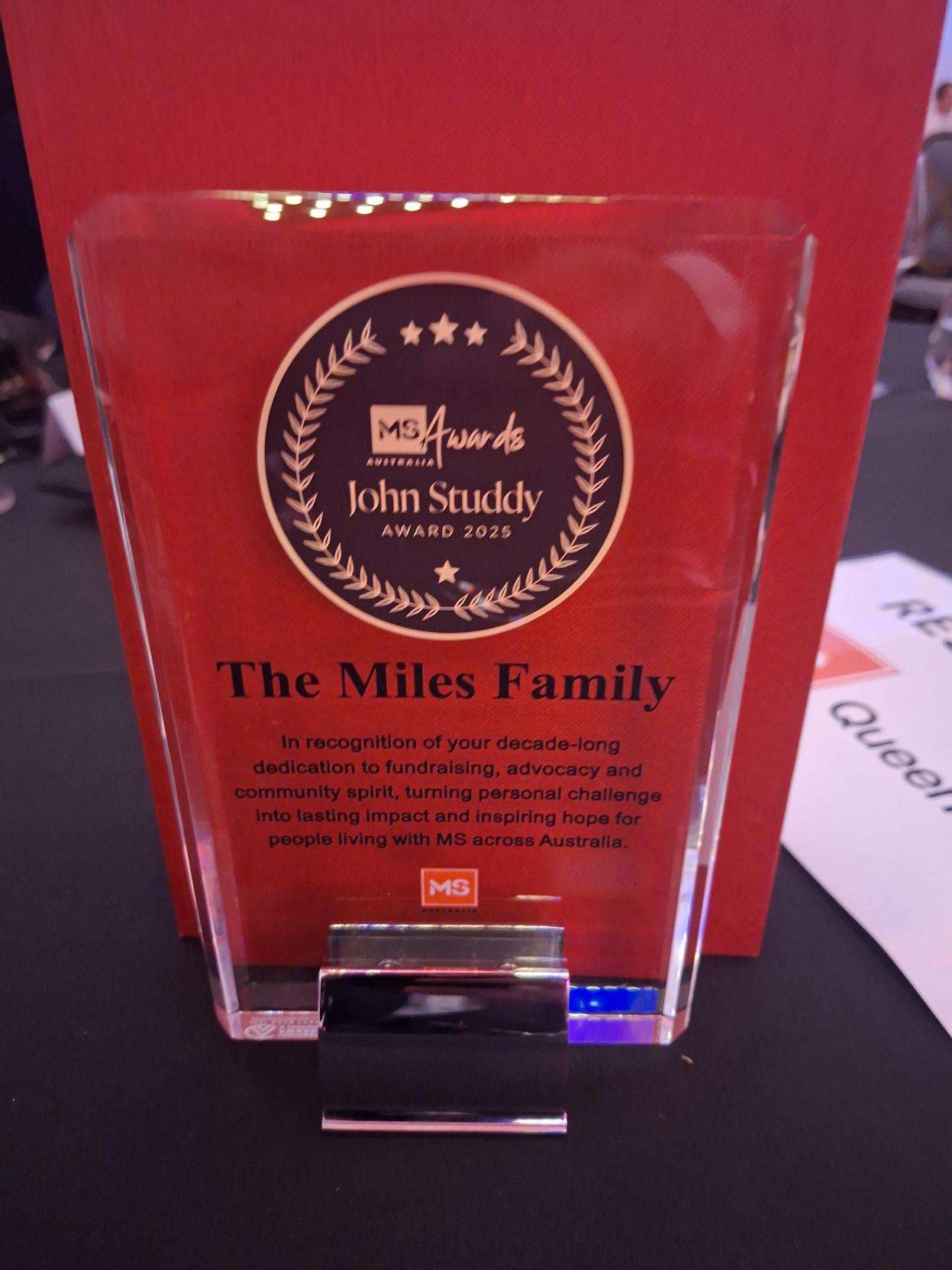On 4 December 2025 in Brisbane, a remarkable and deeply meaningful moment took place. The Miles family, humble, community-minded, and rarely seeking recognition, were honoured with the John Studdy Award, the highest national award presented by MS Australia.