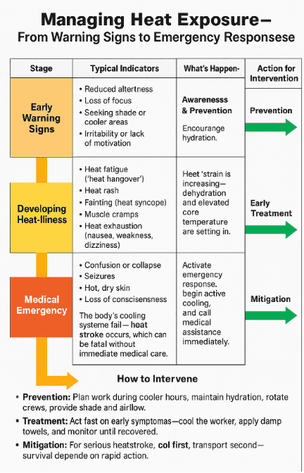 Factors such as air movement, clothing, workload, fitness, hydration, and even medication can all influence how a worker responds to heat. This isn’t about toughness – it’s about physiology.